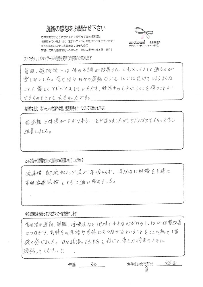 こちらに通い始めてから、自分の体を1から変えていくことがどれだけ大切で食生活や日頃の少しの意識を積み重ねることで妊娠しやすい体に向かっていくのだと肌で感じることができました。