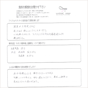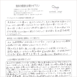 先生と施術中お話をしたりたわいもない話を聞いてもらえるだけで自然と気分が楽になりました。