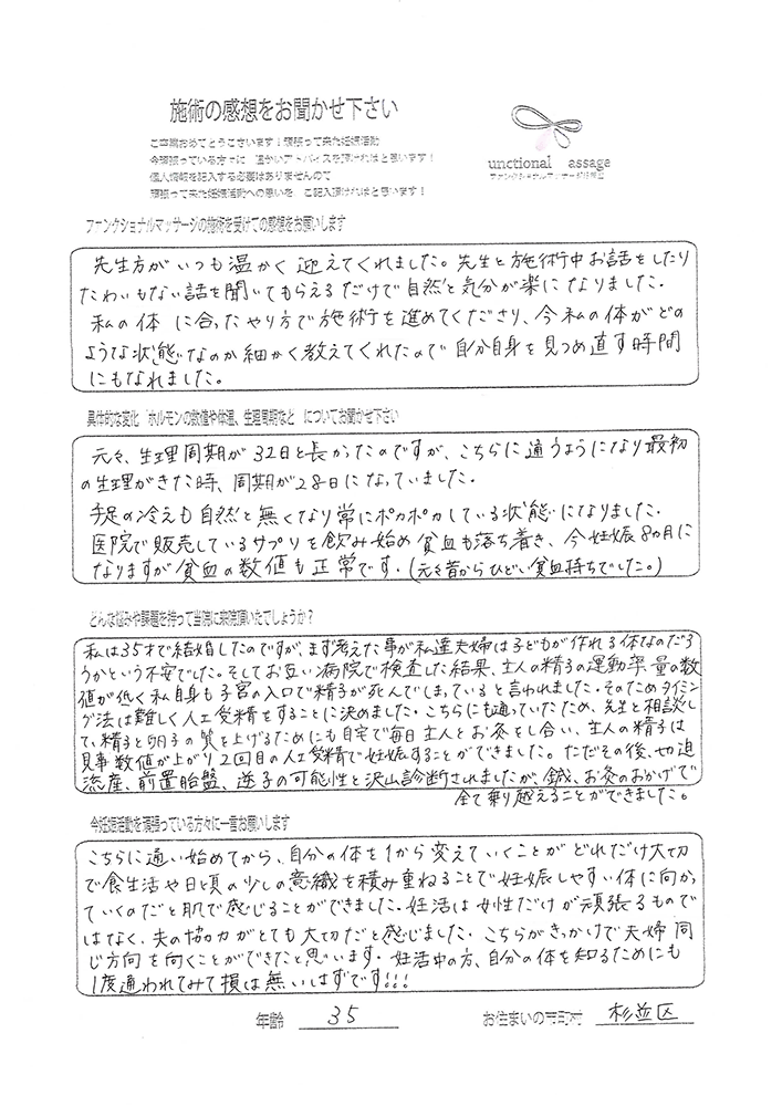 こちらに通い始めてから、自分の体を1から変えていくことがどれだけ大切で食生活や日頃の少しの意識を積み重ねることで妊娠しやすい体に向かっていくのだと肌で感じることができました。