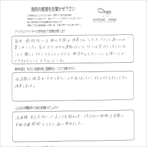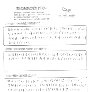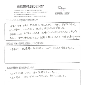 私の体に合ったやり方で施術を進めてくださり、今私の体がどのような状態なのか細かく教えてくれたので自分自身を見つめ直す時間にもなれました。
