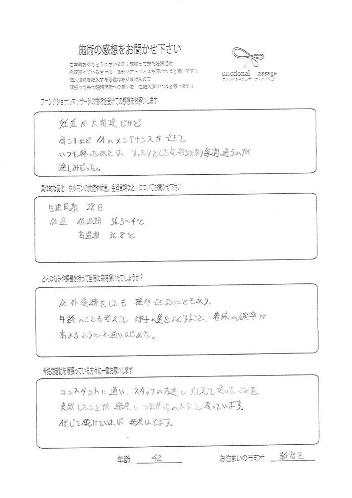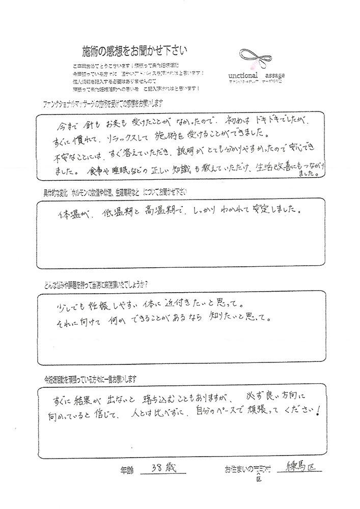 体温も施術を受ける前より、高低差がわかりやすくなり、排卵日の判断がしやすかったです。